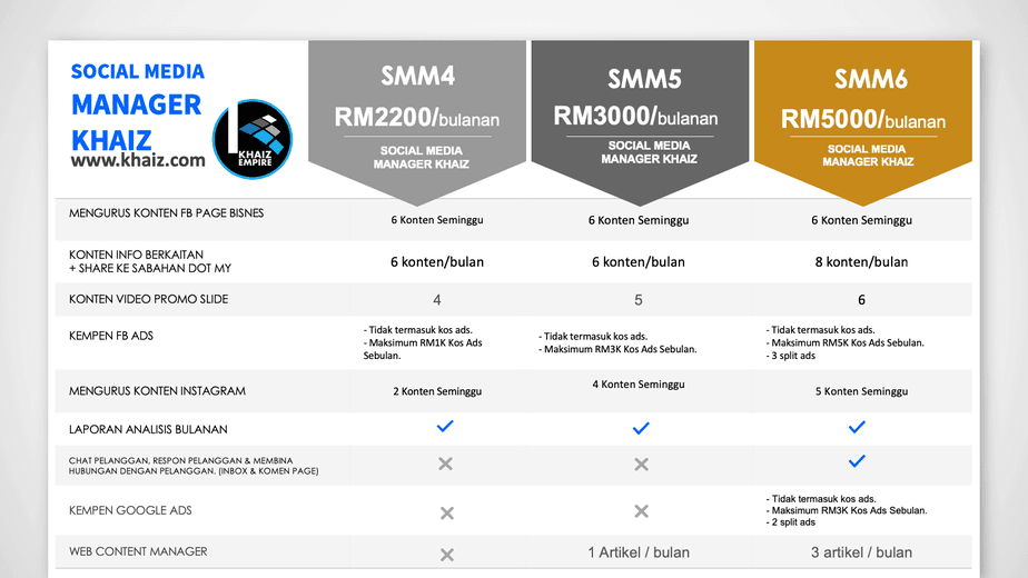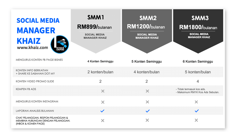 Jika anda berminat untuk mendapatkan pakej Social Media Manager Khaiz ini, anda boleh hubungi kami terus melalui Whatsapp atau melalui talian 0108661760.
